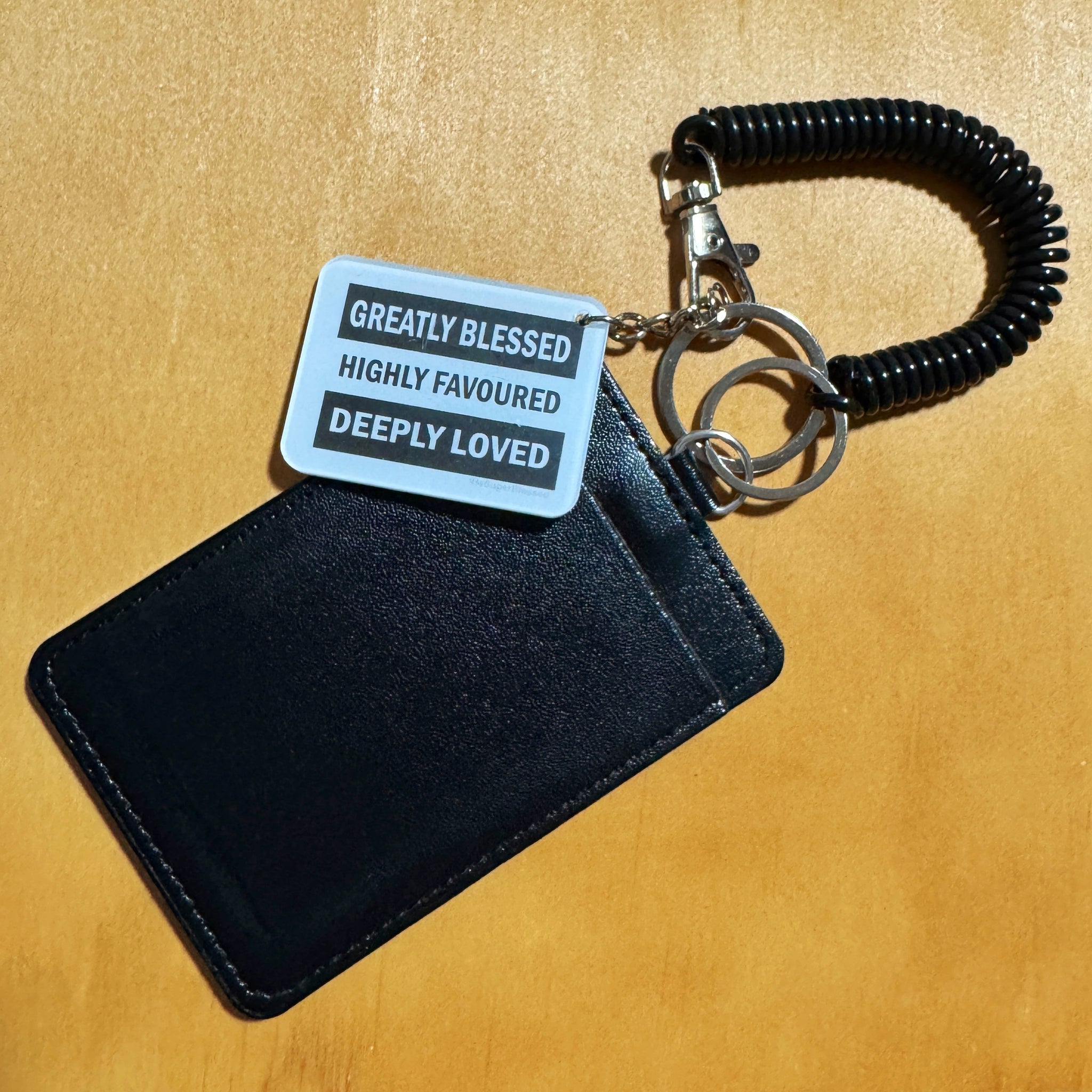 Greatly Blessed Highly Favoured Deeply Loved Black Retractable Spring Coil Keychain with Black Cardholder